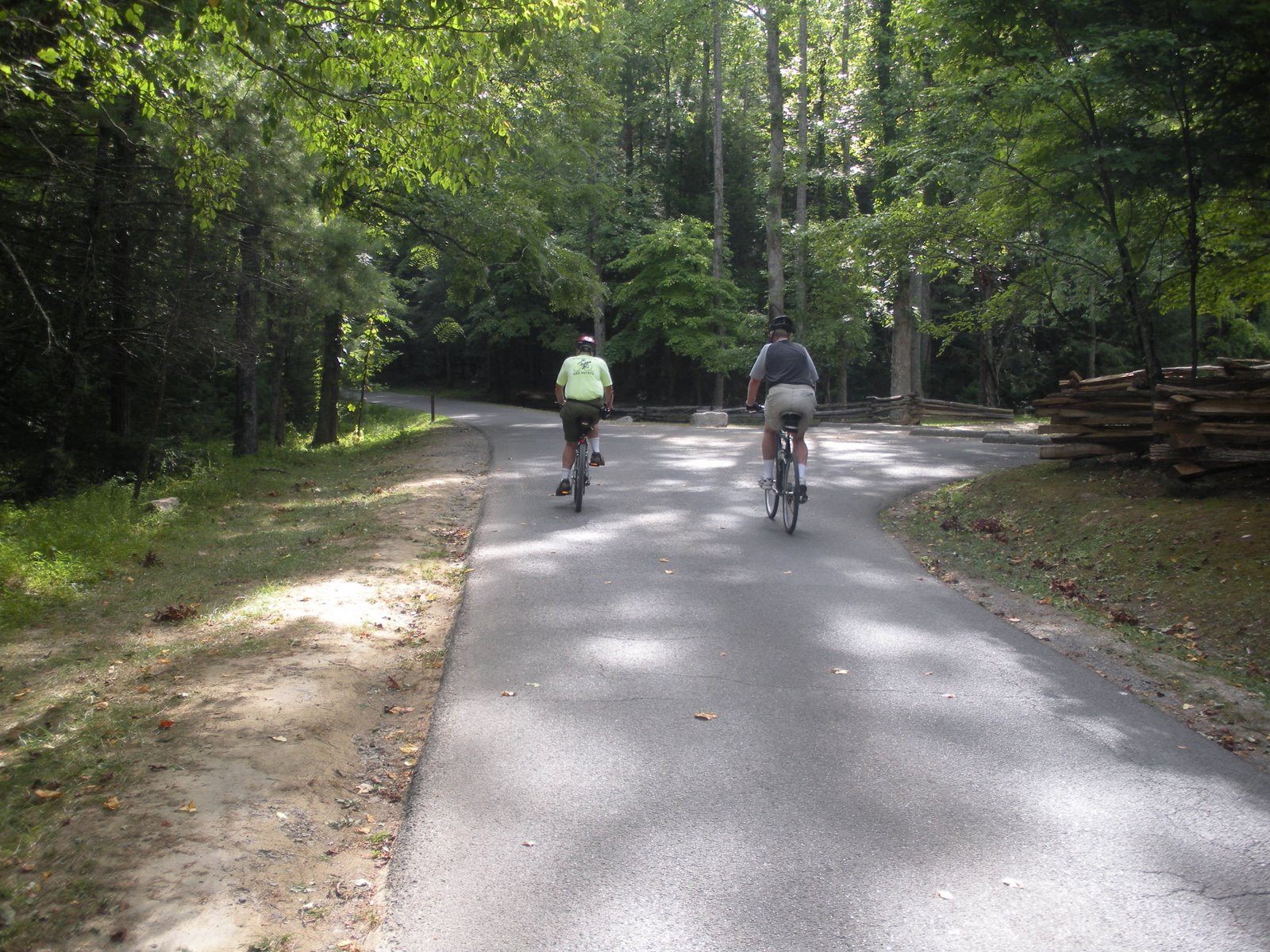 The two bicyclers above are part of a volunteer squad who ride the Cove and help bicyclists. The road fork to the right leads to the cabin in the picture below, the left fork is the loop road and another hill…oh yeah, we are already going uphill.