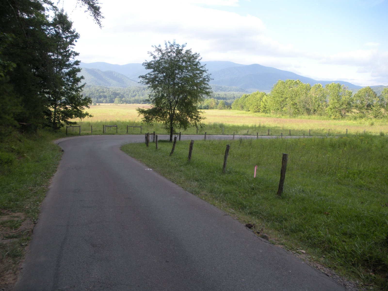 We finally arrived about 7:45 AM and drove immediately to the picnic area. Anticipating that my run would take about 2 hrs, 15 mins, we decided to stake out a parking spot and table. Failure to do so would result in a post run scramble to get out of the park and find a restaurant for breakfast. Prior experience has taught us that picnickers arrive early to the Cades Cove picnic area and tables fill quickly. Once we found a good spot, I stuffed my pockets with my id, camera, luna bar and iPod, put on my visor and left John to set up our picnic and unload his bike. I walked about a quarter of a mile to the beginning of the loop road, took a deep breath, hit the timing button on my watch and began my adventure.