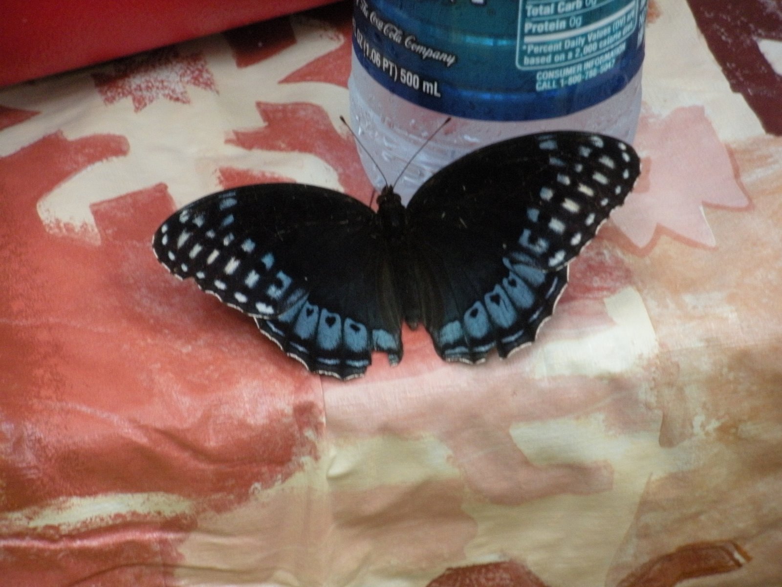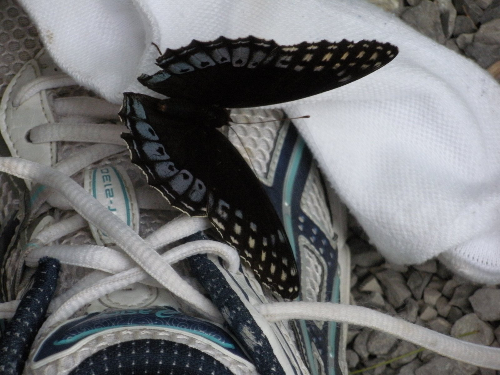 A butterfly flew in and stayed a while. Not only did he (she) enjoy the condensed water on the outside of John’s bottle (above) but also the salt from my running socks (below).