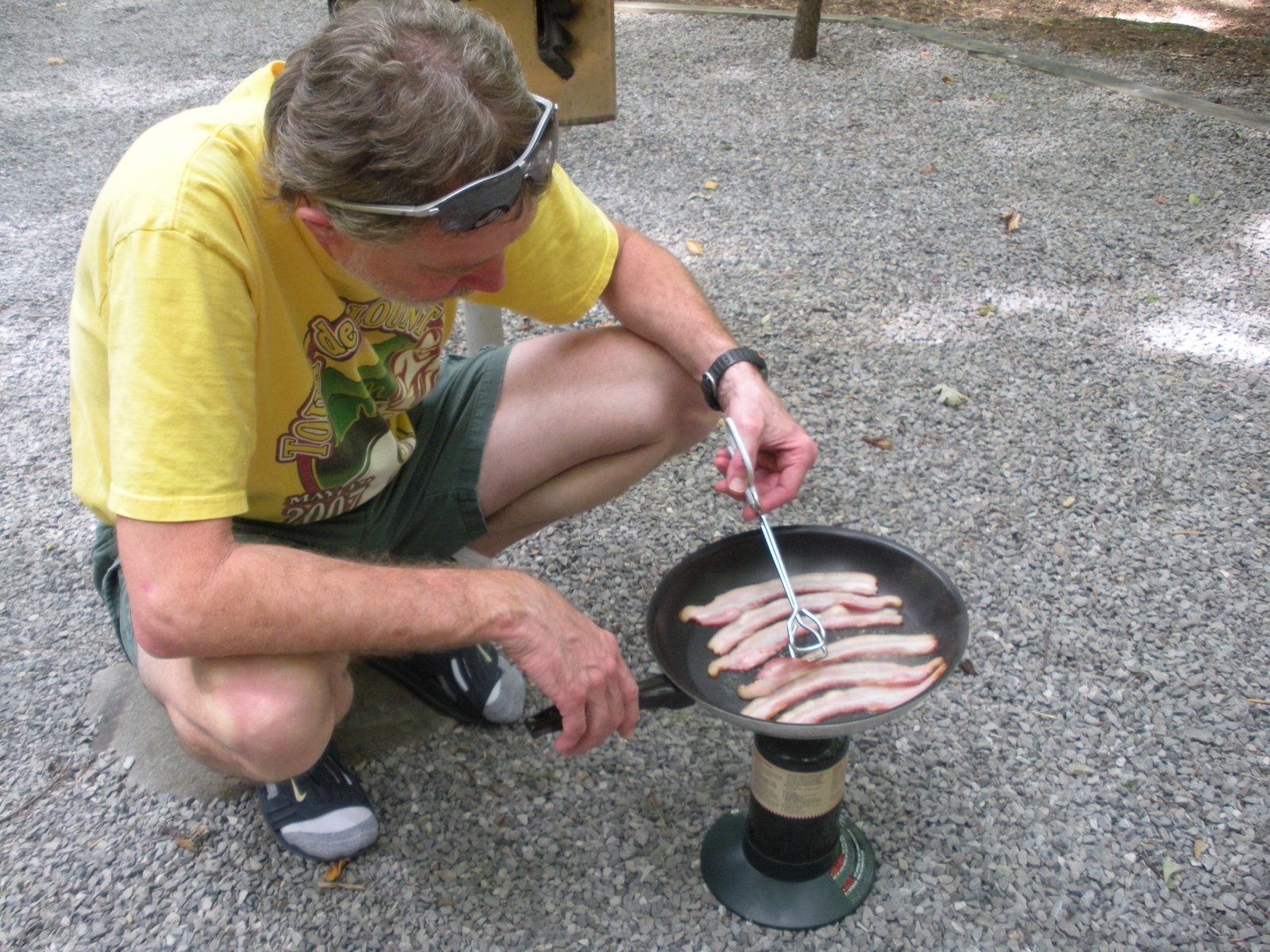 John cooking bacon. We had 3 pieces each but wished we had 6 each. Oh so good, oh so bad for us!