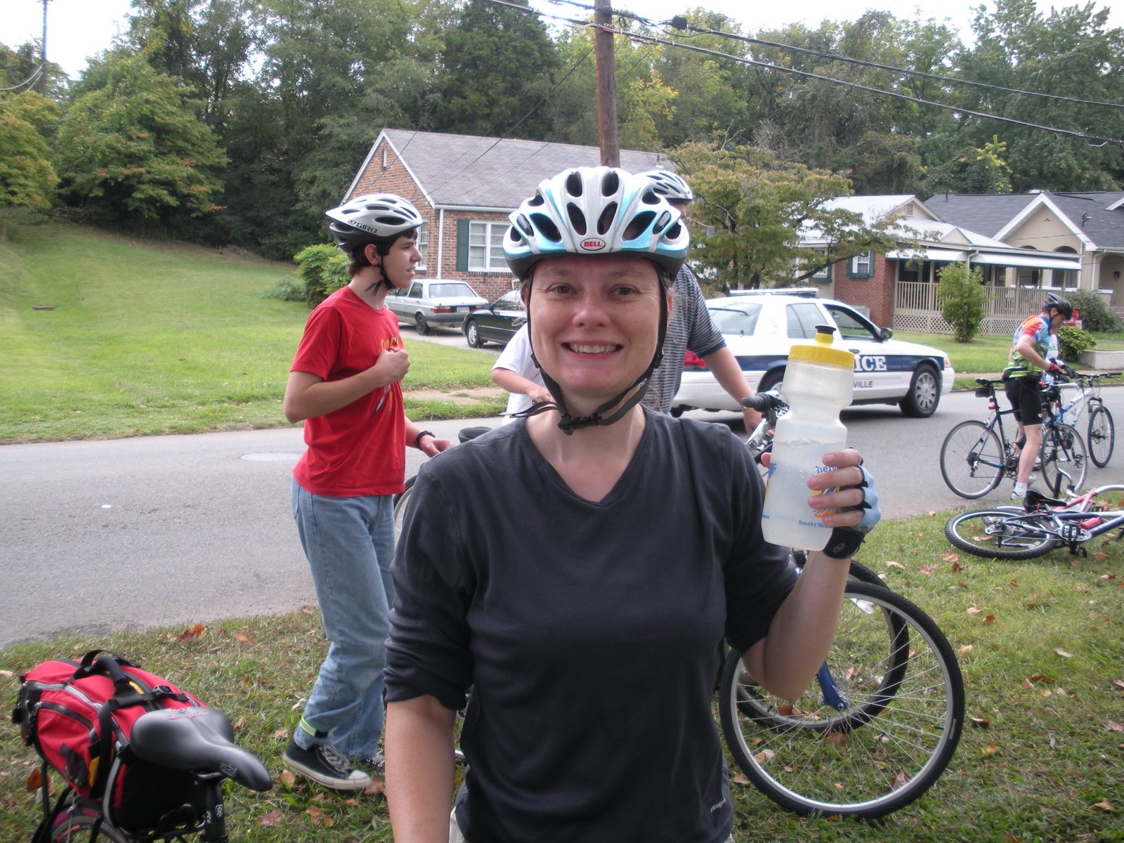 Us at the first stop about 4 miles into the effort (yes, I am asking for an updated helmet for Xmas). Police and other volunteers were stationed along the 10 mile route, blocking traffic at intersections. Residents were great, coming to the edge of the road to take pictures, wave and generally welcome riders into their neighborhood.