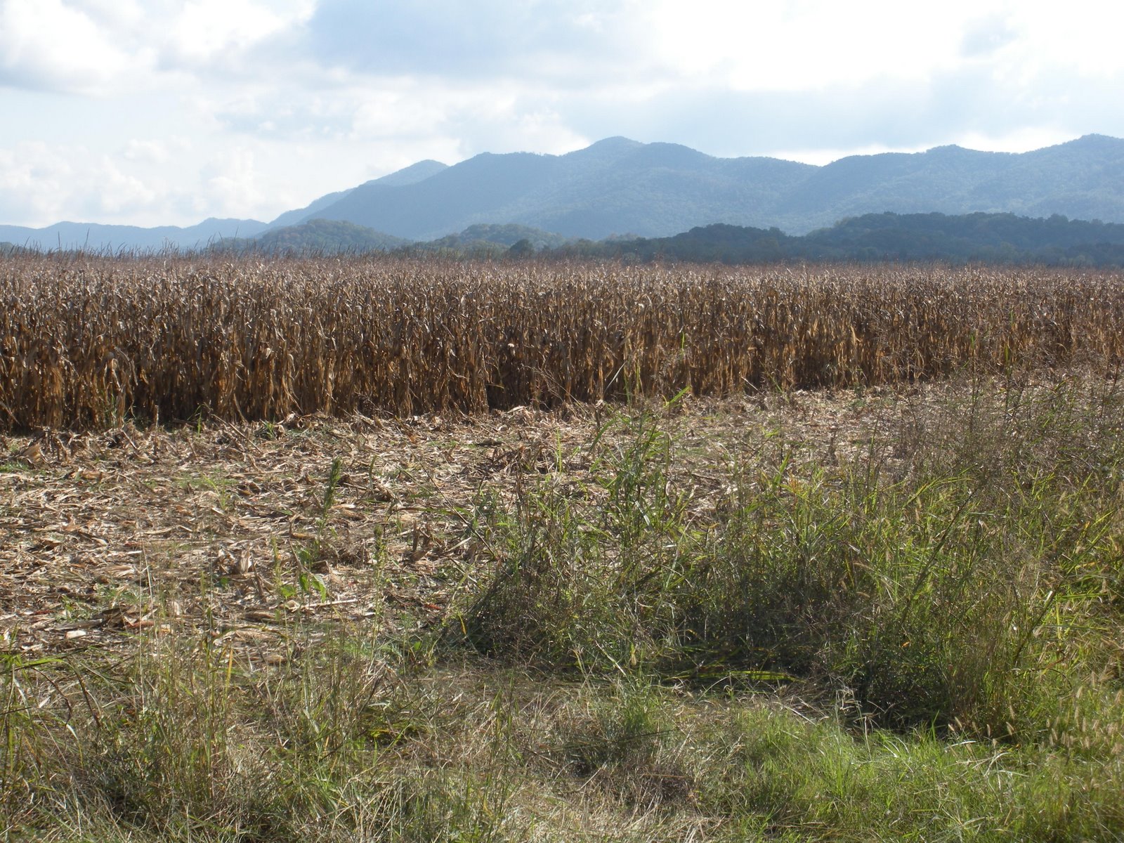 Cornfields at the beginning of Old Walland Road. In the distance are the rolling foothills of the Great Smoky Mountains National Park.