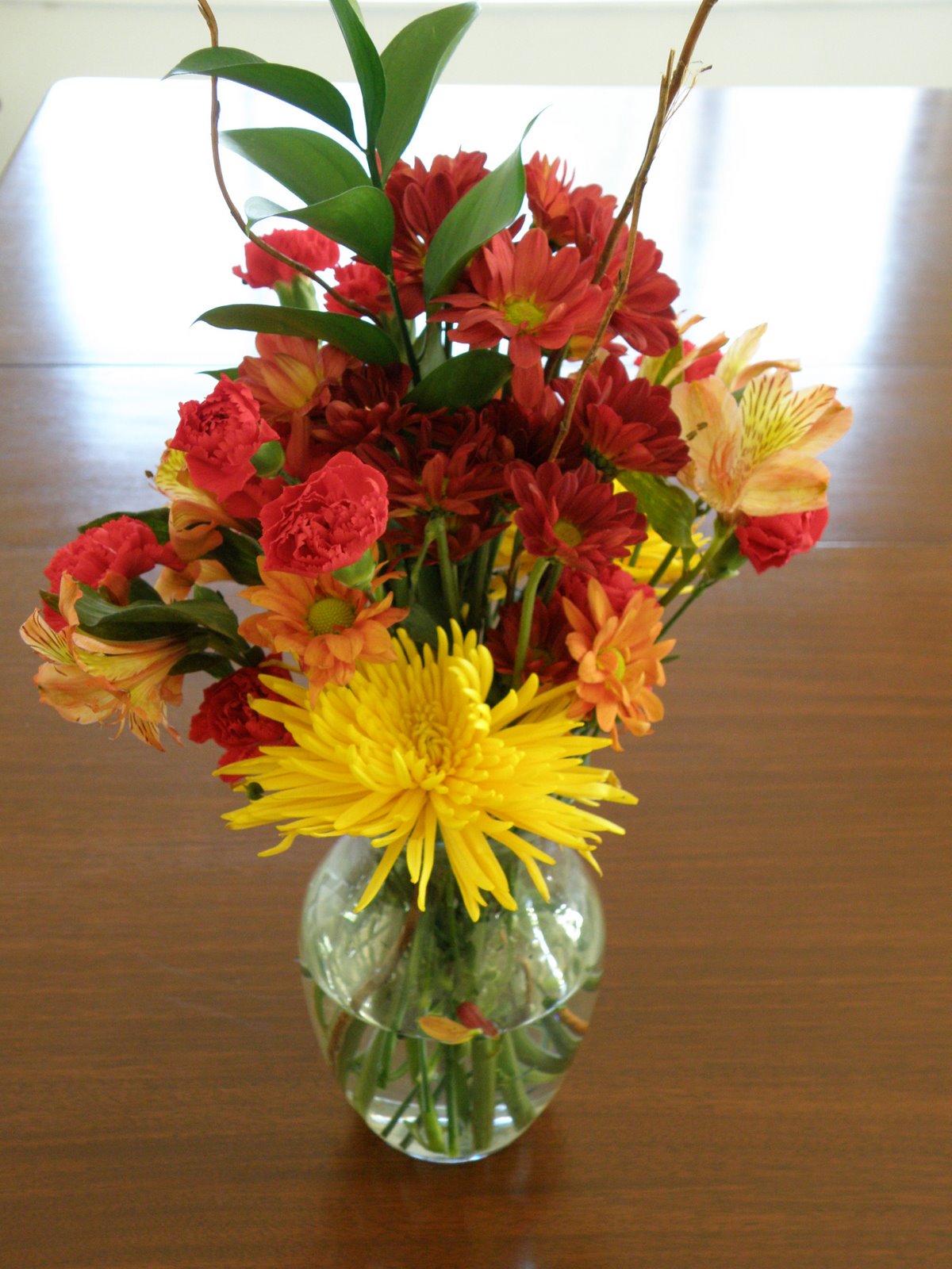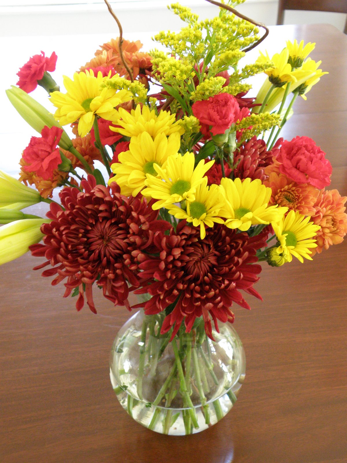 This bouquet is for my mother. I bought the flowers from the floral department in our local Kroger and arranged them in a vase I have around the house. The crooked willow branches were purchased sometime this summer at the local farmer’s market and stored in the garage for later use.