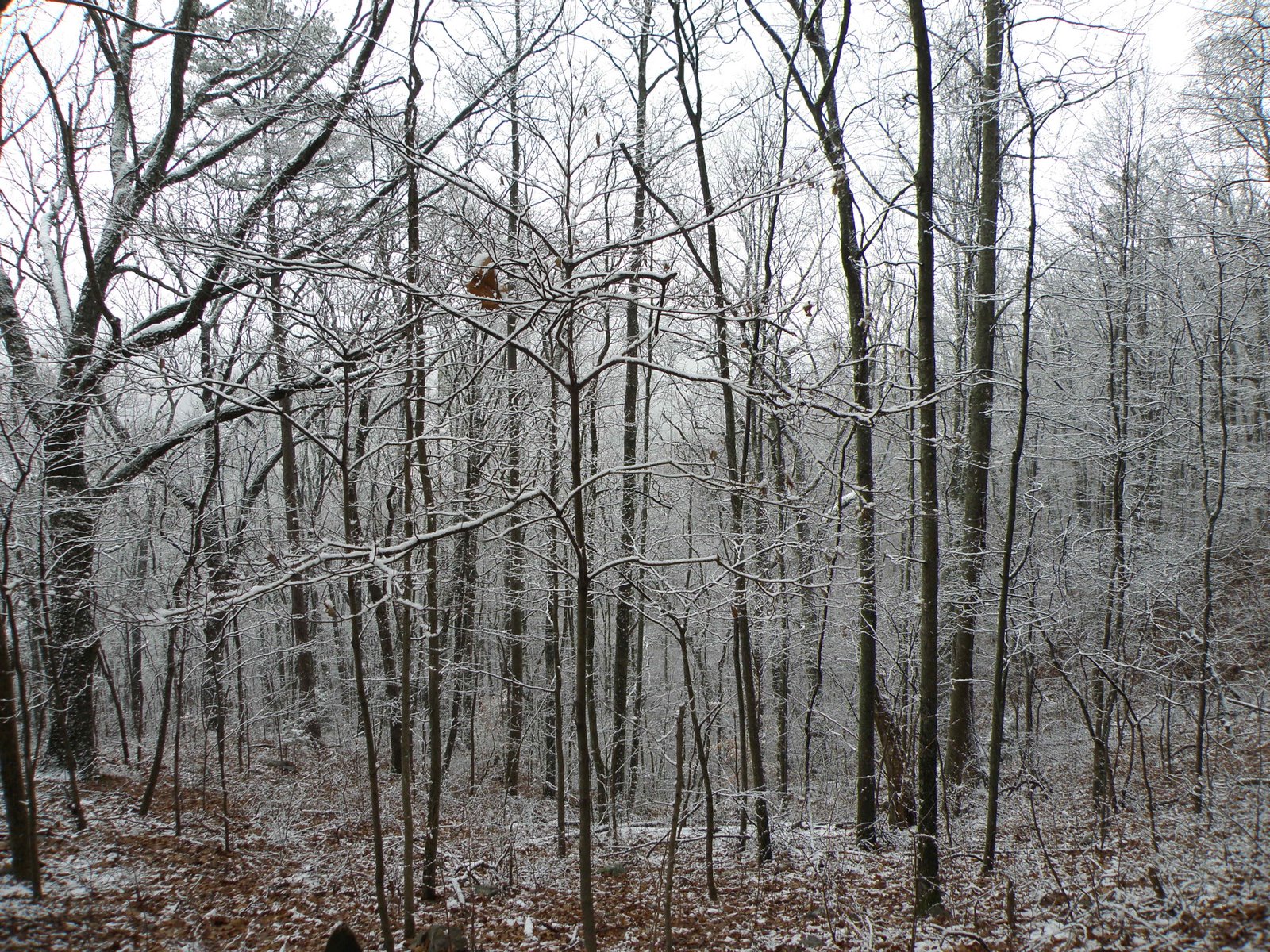 Stark, brown trees are a nice contrast to the white snow and grey sky