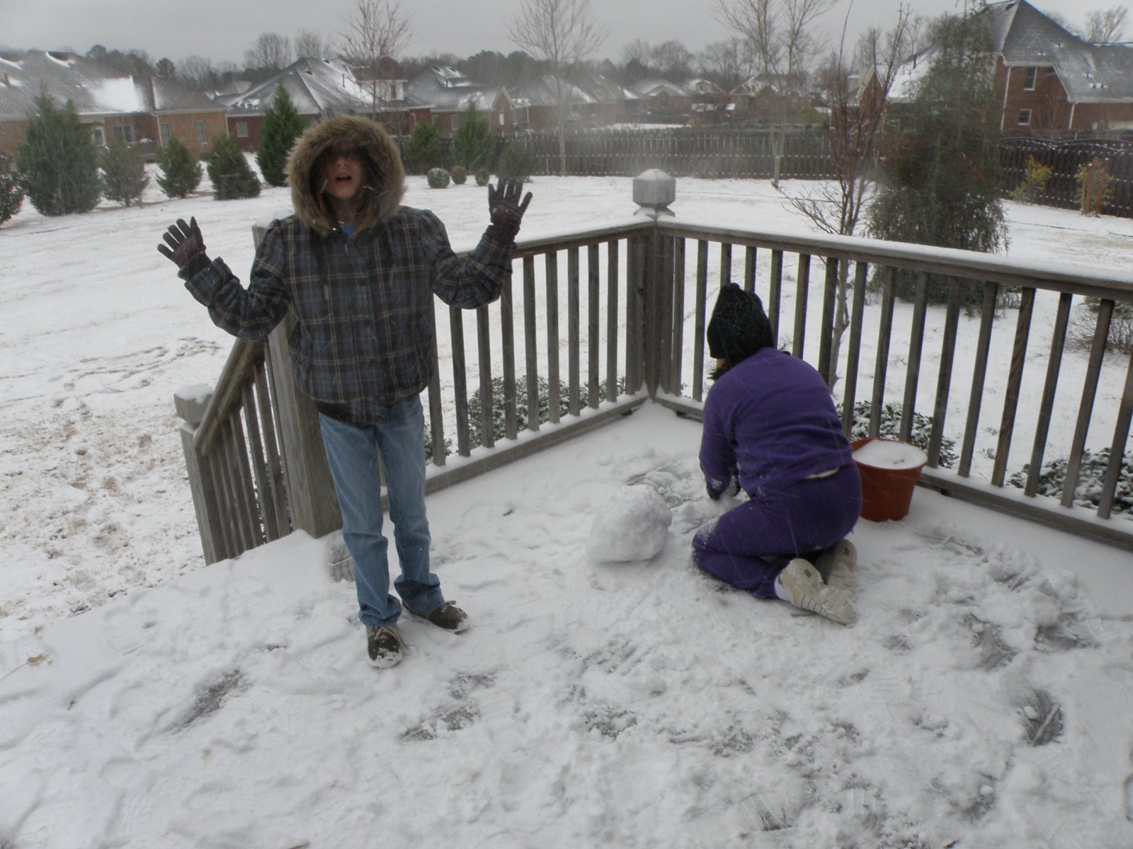 With snow comes the desire to build a snowman. Unfortunately the snow was incredibly dry and did not stick together very well. John’s nieces, Caitlin (left) and Jessica (right) were very creative in their efforts to build a snowman. Snowman building tools included a bucket, shovel and water. The girls stuck mostly to the deck where the snow was deeper and easier to manipulate.