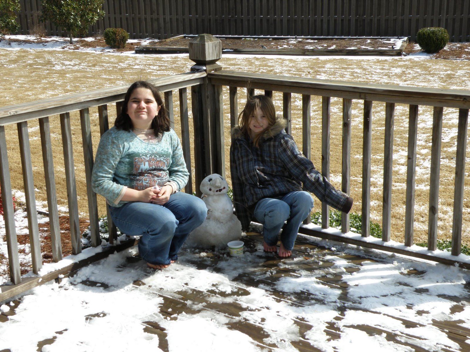 As you can see, this photo was taken later in the morning. Most of the snow in the yard has melted. Jessica and Caitlin are proudly showing off “Bob,” the snowman. Not enough to snow to make him bigger and he started the melt process as soon as the sun came out.