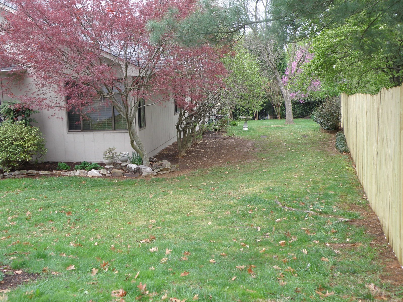 to this new fence. The contractor still has to cut in a scallop pattern to even up the boards…not like the stair steps above. If you could see my neighbor’s house, you would understand why the fence is there.