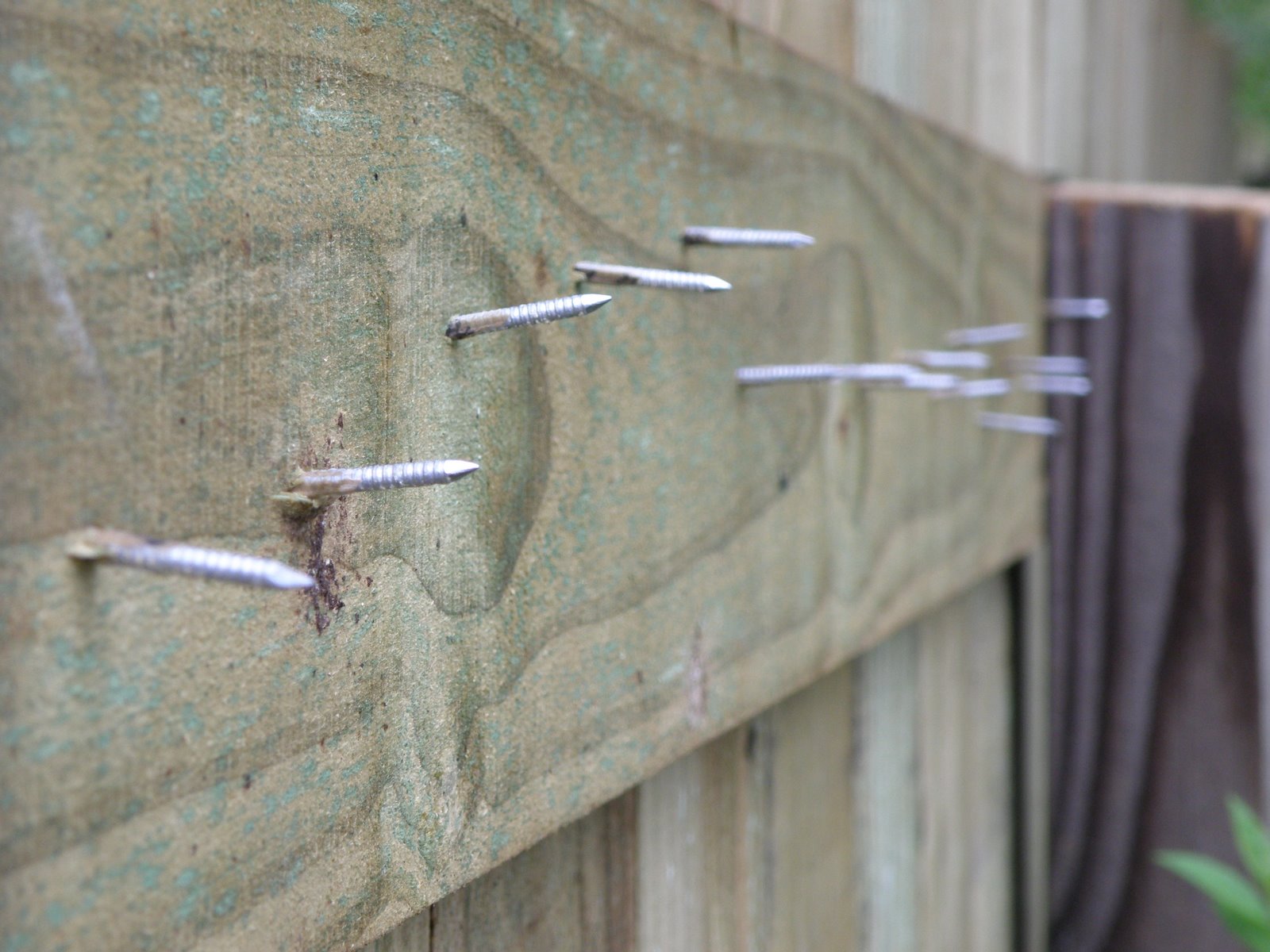 Oh Mr. Contractor Man, what the heck is this? A new torture device?? It is a potential lawsuit because the nails are sticking out on my neighbor’s side the fence. I made a quick phone call this morning and my contractor will shave these off on Monday. He should have caught this!!