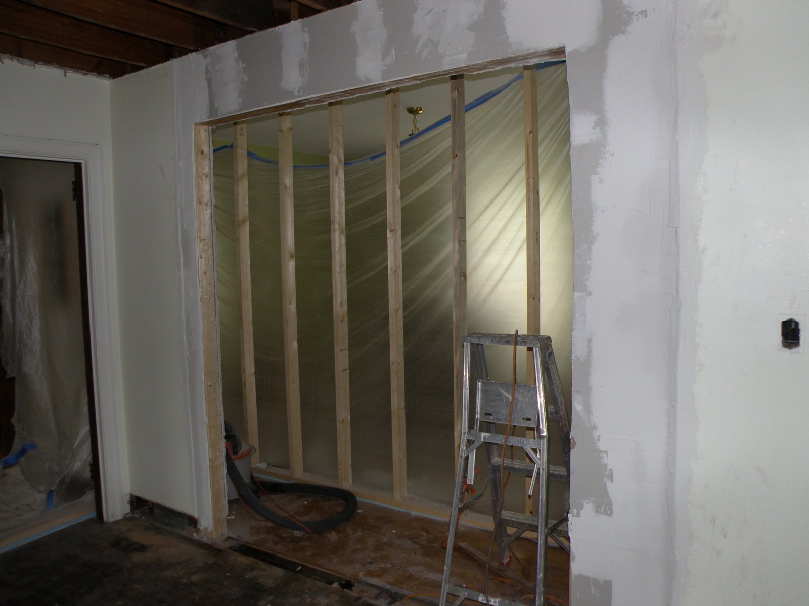 This was once a very narrow door opening into the dining room. Our contractor has moved some plumbing and enlarged the opening. We hope this will result in an open feeling between the kitchen and dining room.