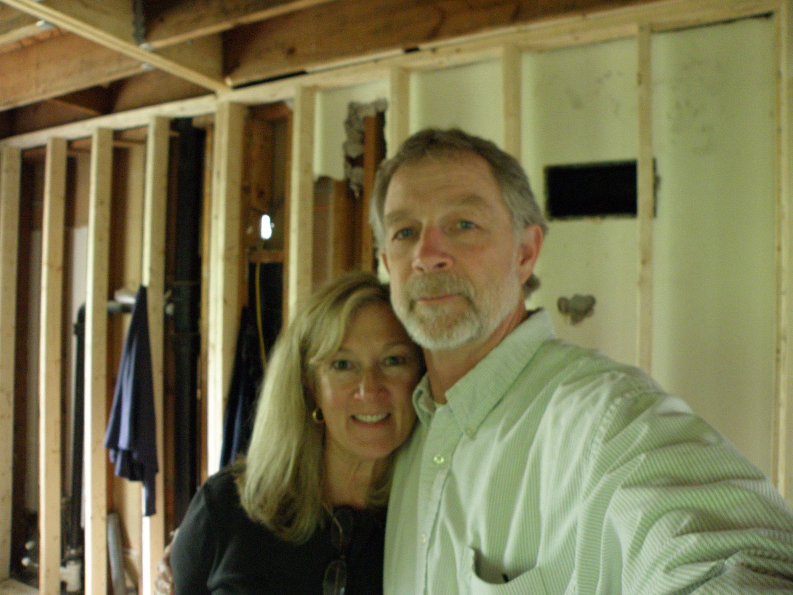 Here we are, smiling in our wreck of a kitchen. Behind us is a wall that is being rebuilt. The brown wall section was once a separate room. The white wall section sits forward more than the brown. New sheet rock will be nailed up to even everything up.
