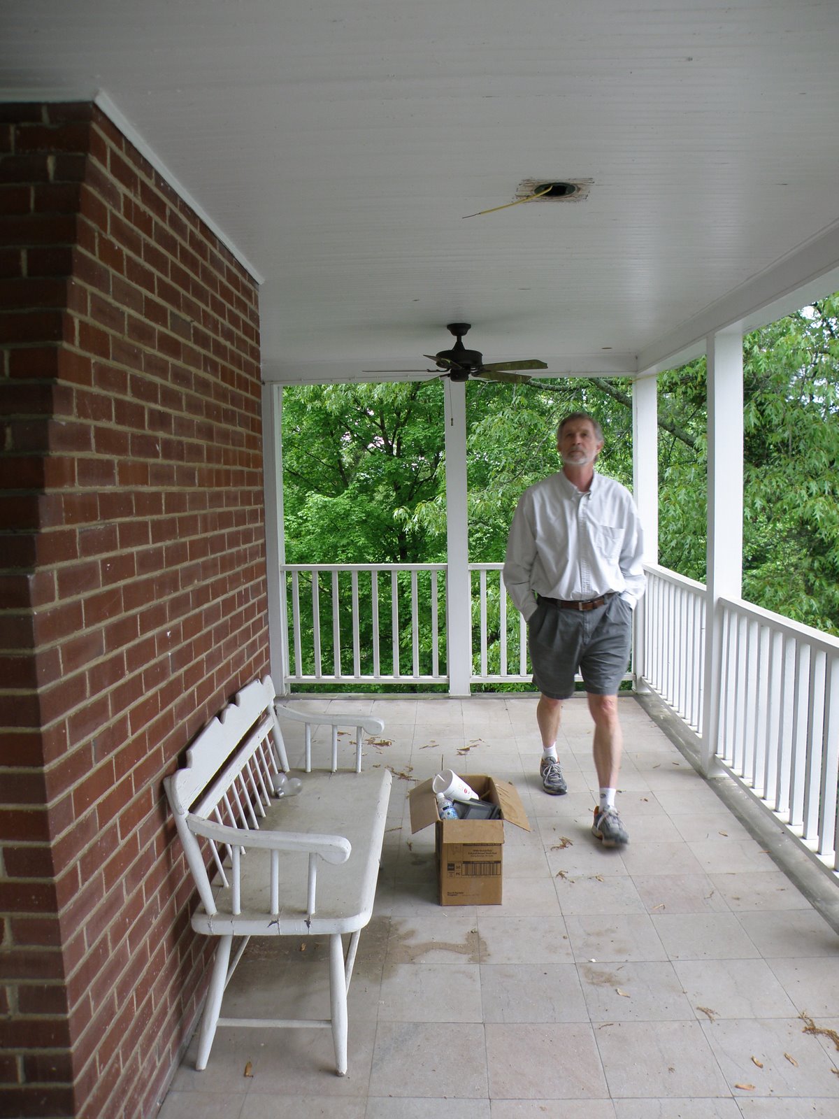 Here is John on our side porch (off the living room). We have added two ceiling fans. The missing fixture is the light fixture. Did I mention that we had to replace almost every fixture in the house? The old service was 100 amp, the new service is 200 amp…the old fixtures don’t work. Most fixtures are the oiled bronze look and are mostly modern. It’s a fun look with the 1940’s house.