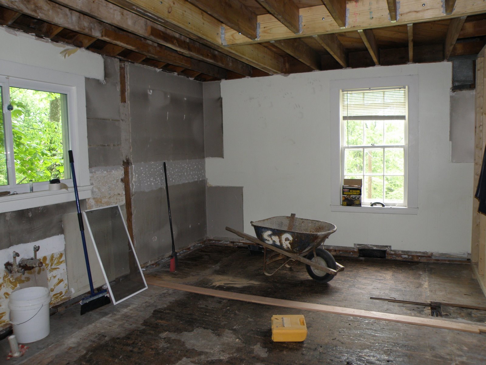 The sink and refrig will go on the left side. Look up and you can see the new joist supports. When the ceiling was pulled down, the joists that are now supported were just hanging there, not connected.