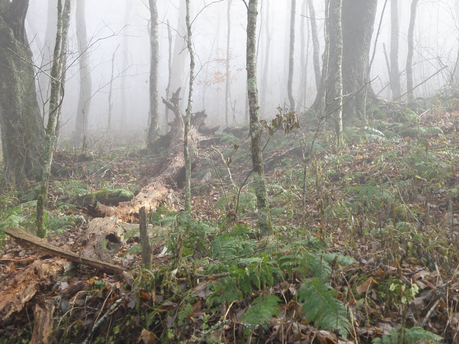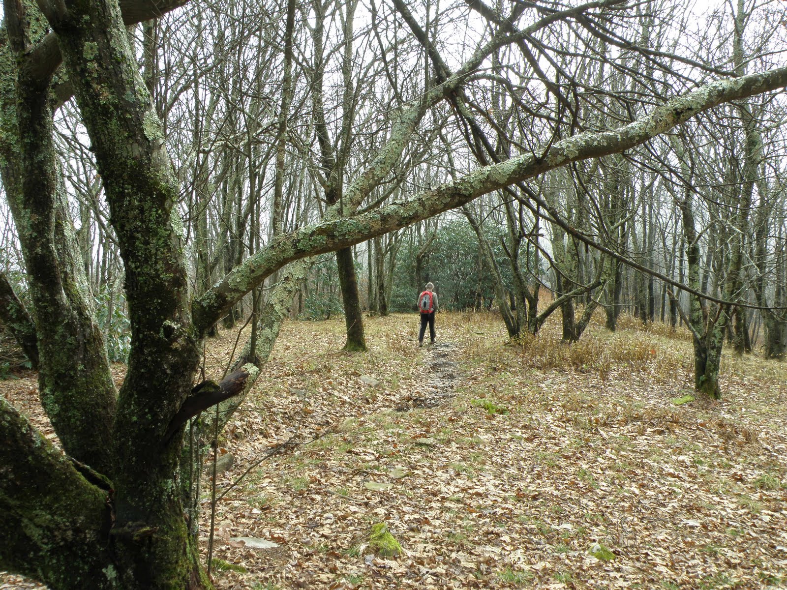 Hiking in the Smokies involves hiking through a series of micro-climates. The lower elevations are of course, warmer. The higher the climb, the cooler the temperature. Clouds, rain, snow, sun and just about anything else goes at different elevations. Yesterday, at some point on Bote Mtn Trail, we entered a section of trail buried in thick, low hanging clouds. Trees dripped with moisture and the sun was mostly blocked. Even though our cores were heated up from the climb, our hands, ears and faces were cold.