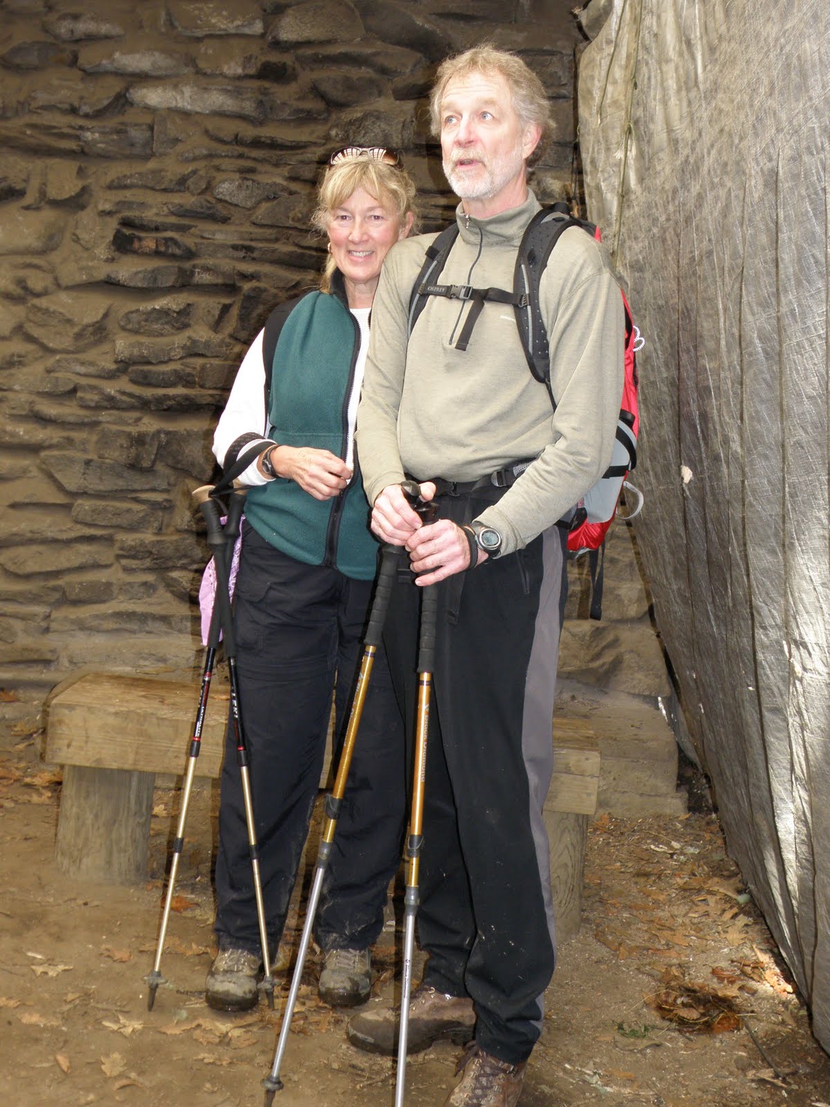 John and Beverly standing in front of the shelter fireplace