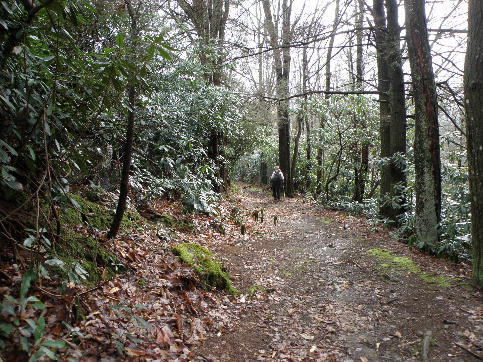 Beverly hiking through a rhodoendron grove near the junction of the AT