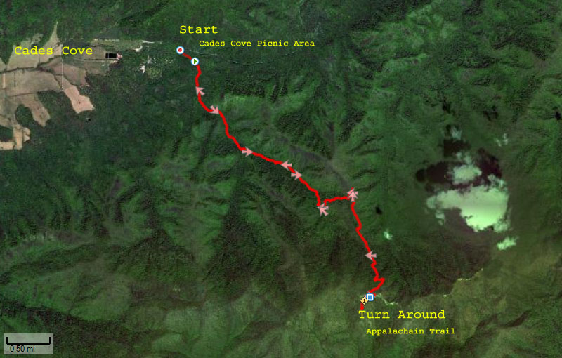 We left Knoxville at 8:00 AM with plans to meet Will and Kim at the trail head. The drive was mostly uneventful although we got caught behind the last of the Knoxville Track Club Mill House Classic 15k racers and behind a number of bicyclists who were grabbing the chance to put in some miles on a cool, dry fall day. Even with slow downs we arrived at the trail head (Cades Cove Picnic Area) about the same time as Will and Kim.