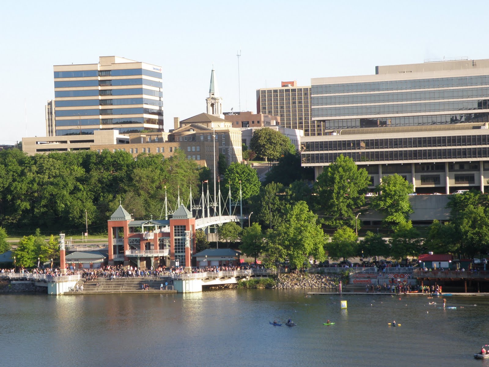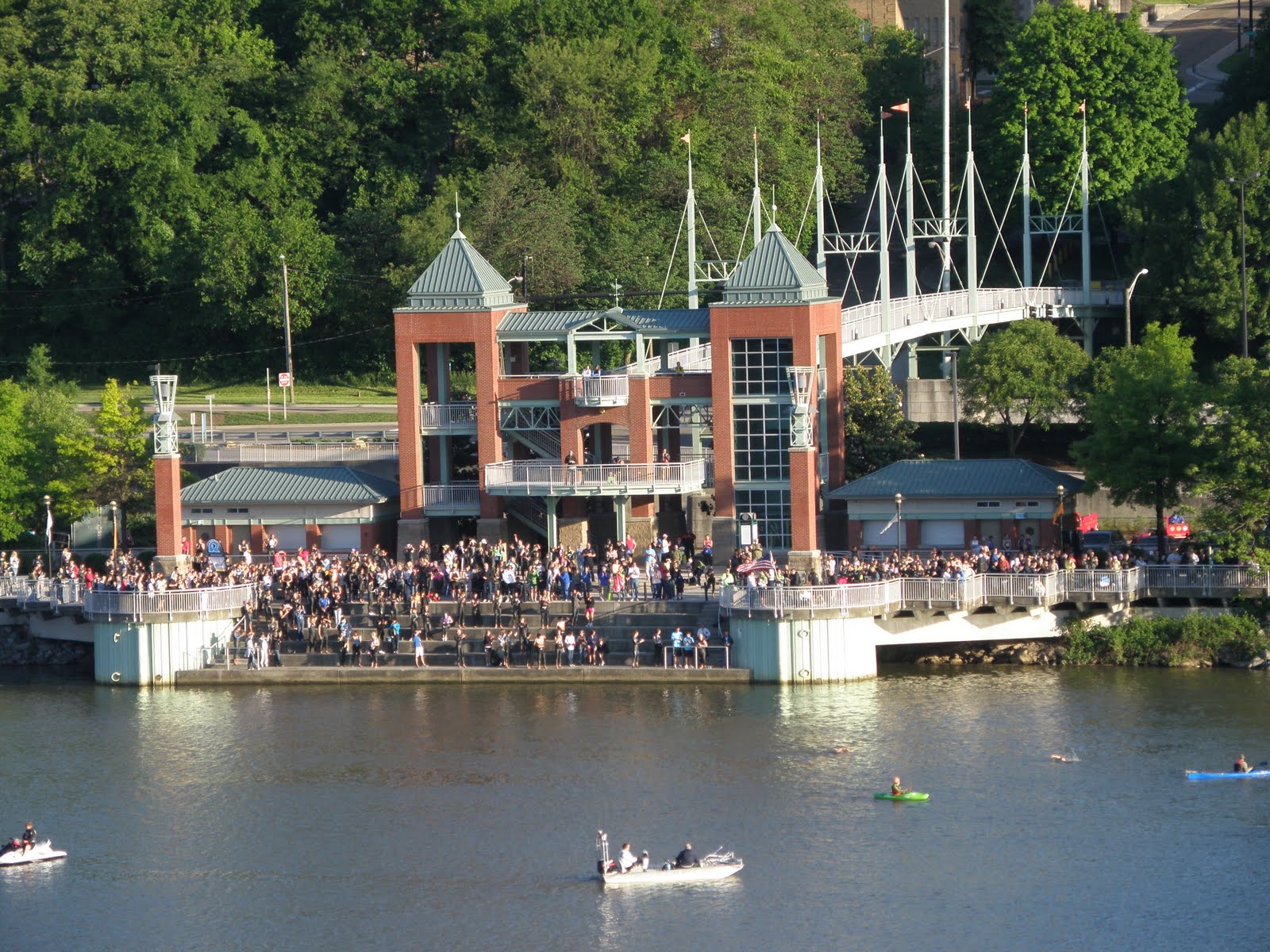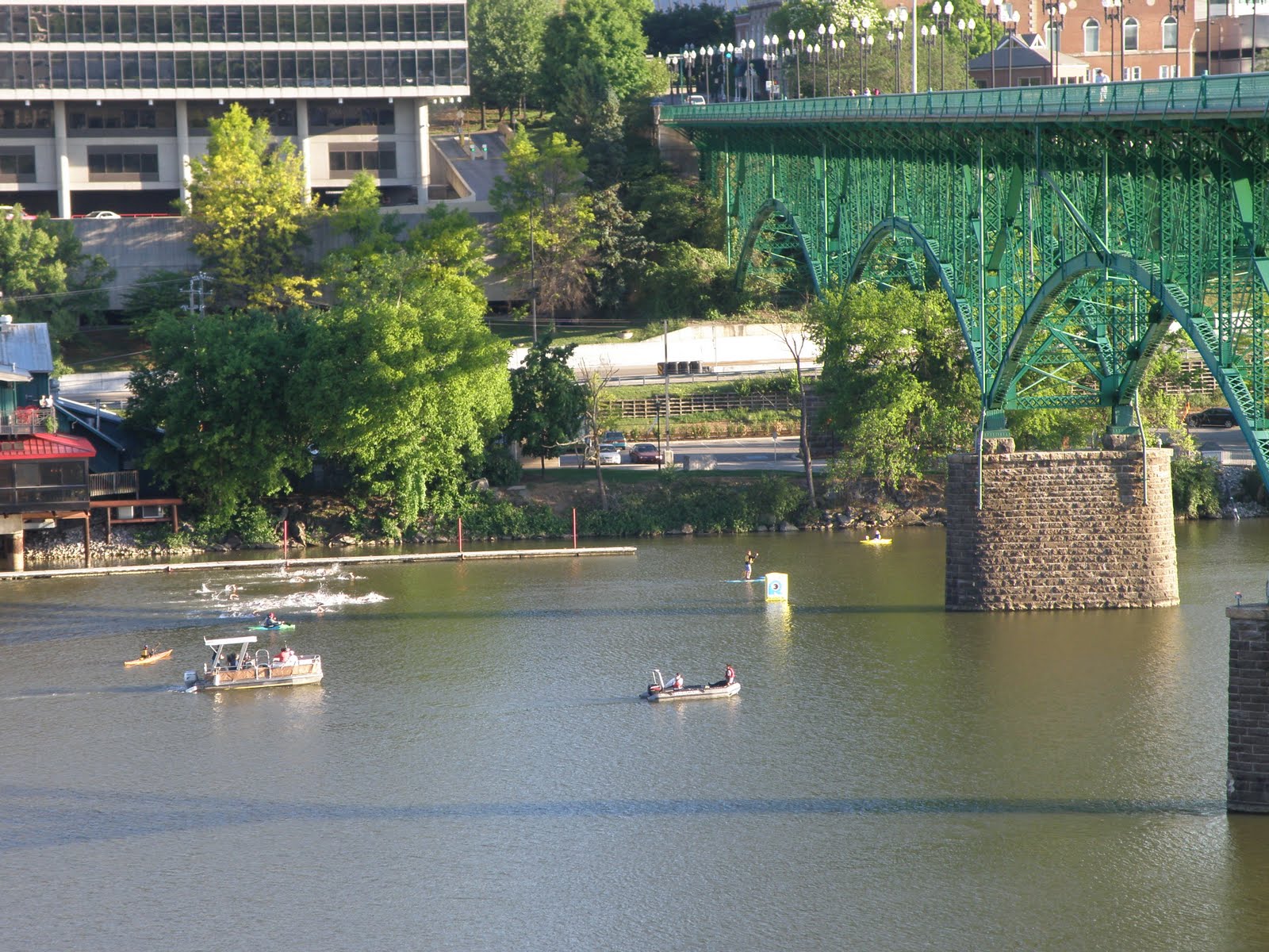 A view of downtown Knoxville and the waterfront from the Gay Street Bridge. Pro athletes are on the dock and in the water warming up.