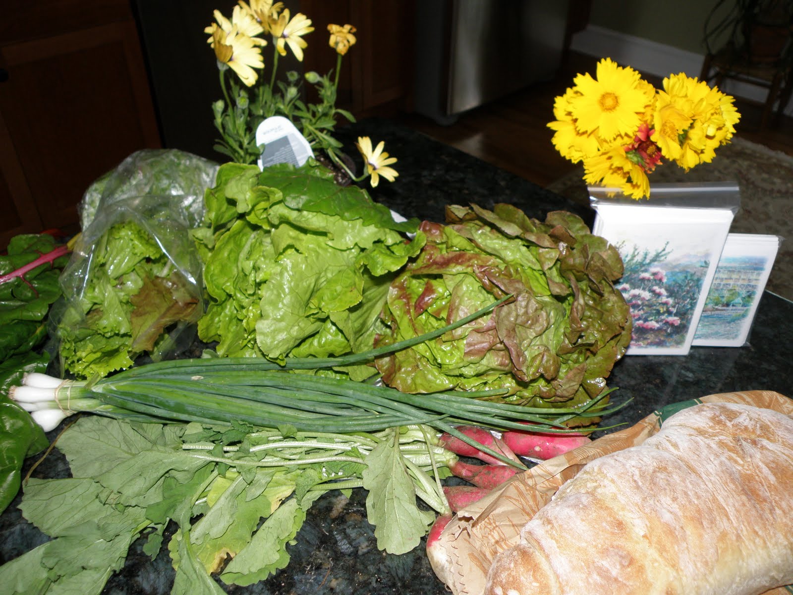 Filled my shopping bag with flowers for the table, daisies for the front garden, lots of fresh lettuce, radishes, chard, green onions, fresh baked bread and local artist note cards. So glad the Farmers Market is back for the summer!