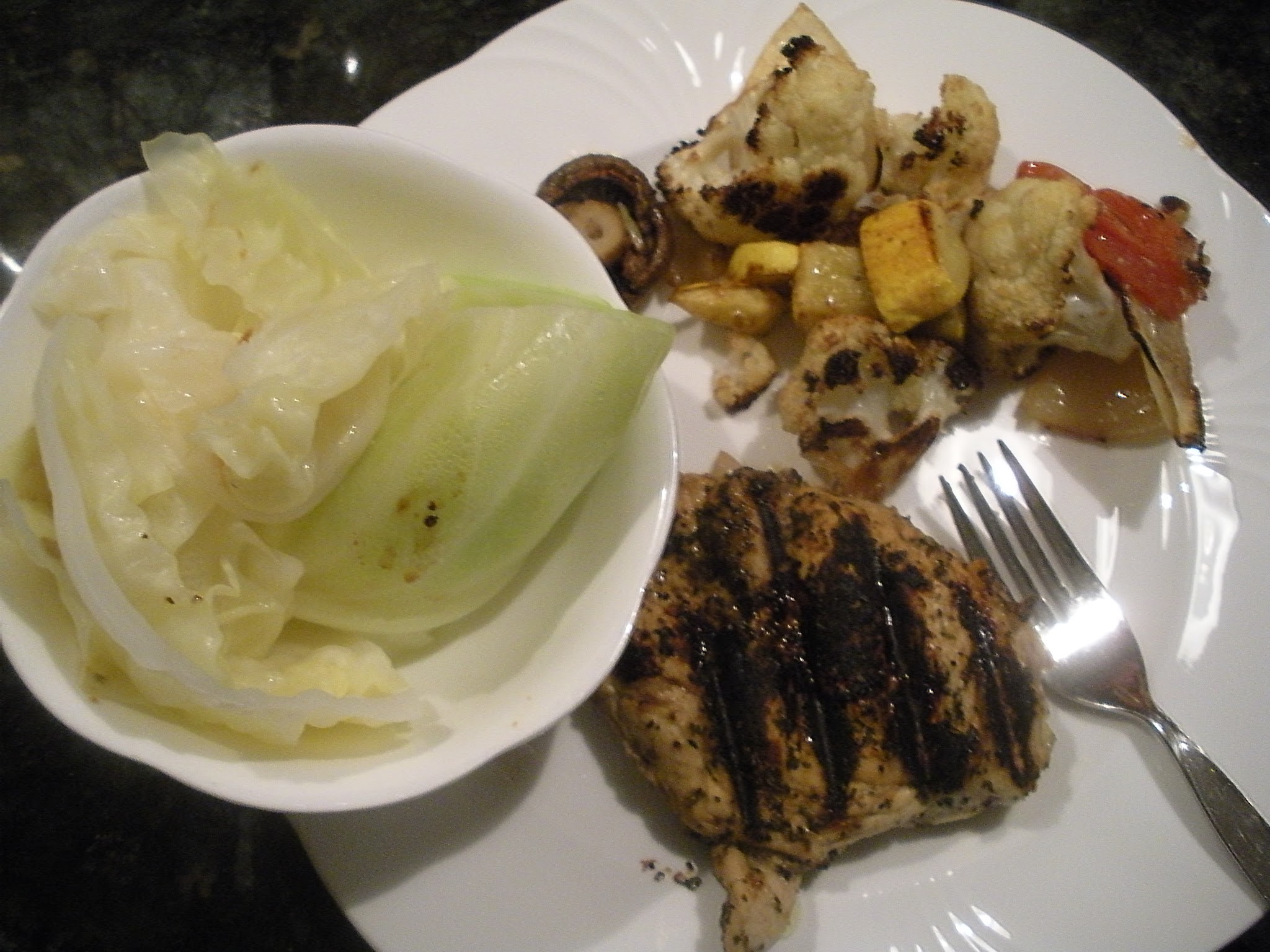 Tonight’s dinner, cabbage, grilled chicken and grilled vegetables