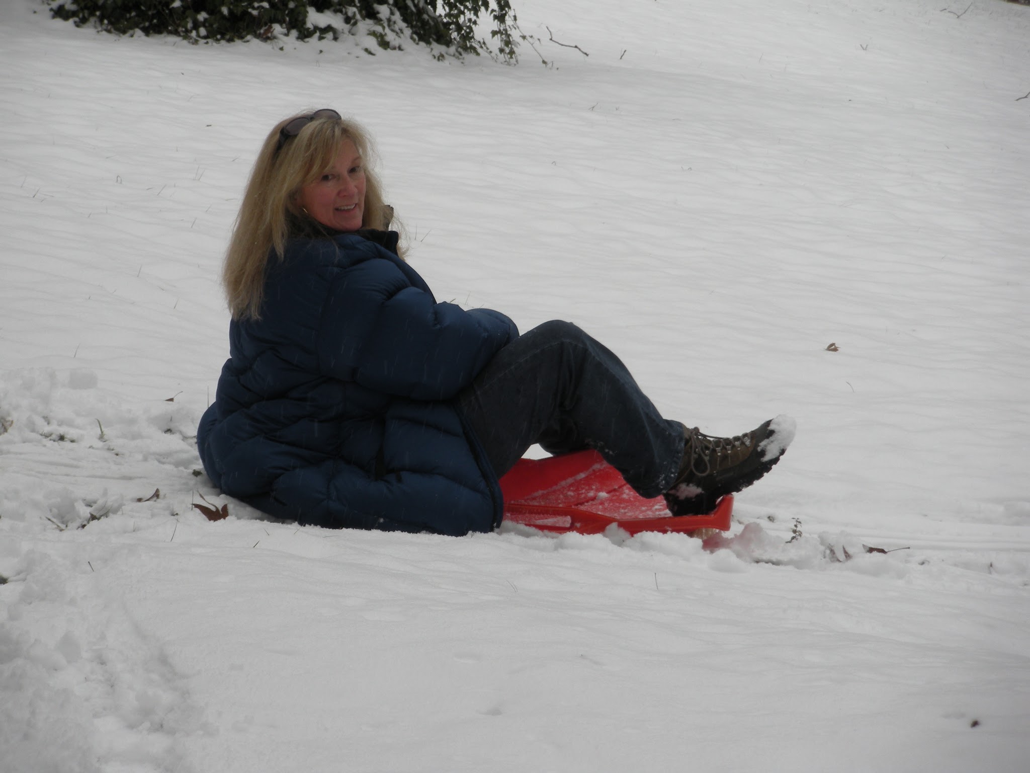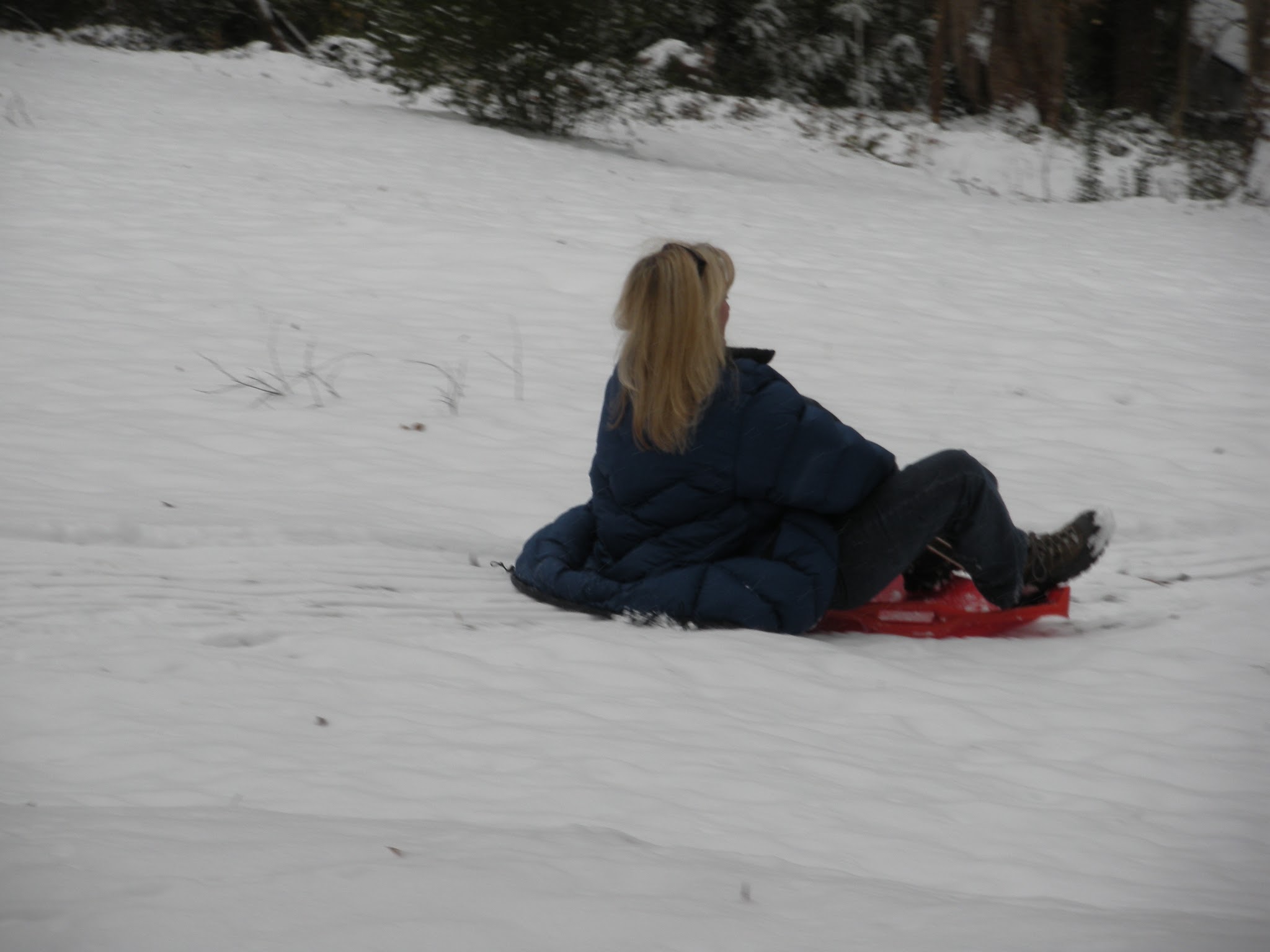 Okay, here I go! The first run was pretty slow, as a matter of fact I had to scoot a bit. The second run got faster and, as the snow packed down, the runs got faster.