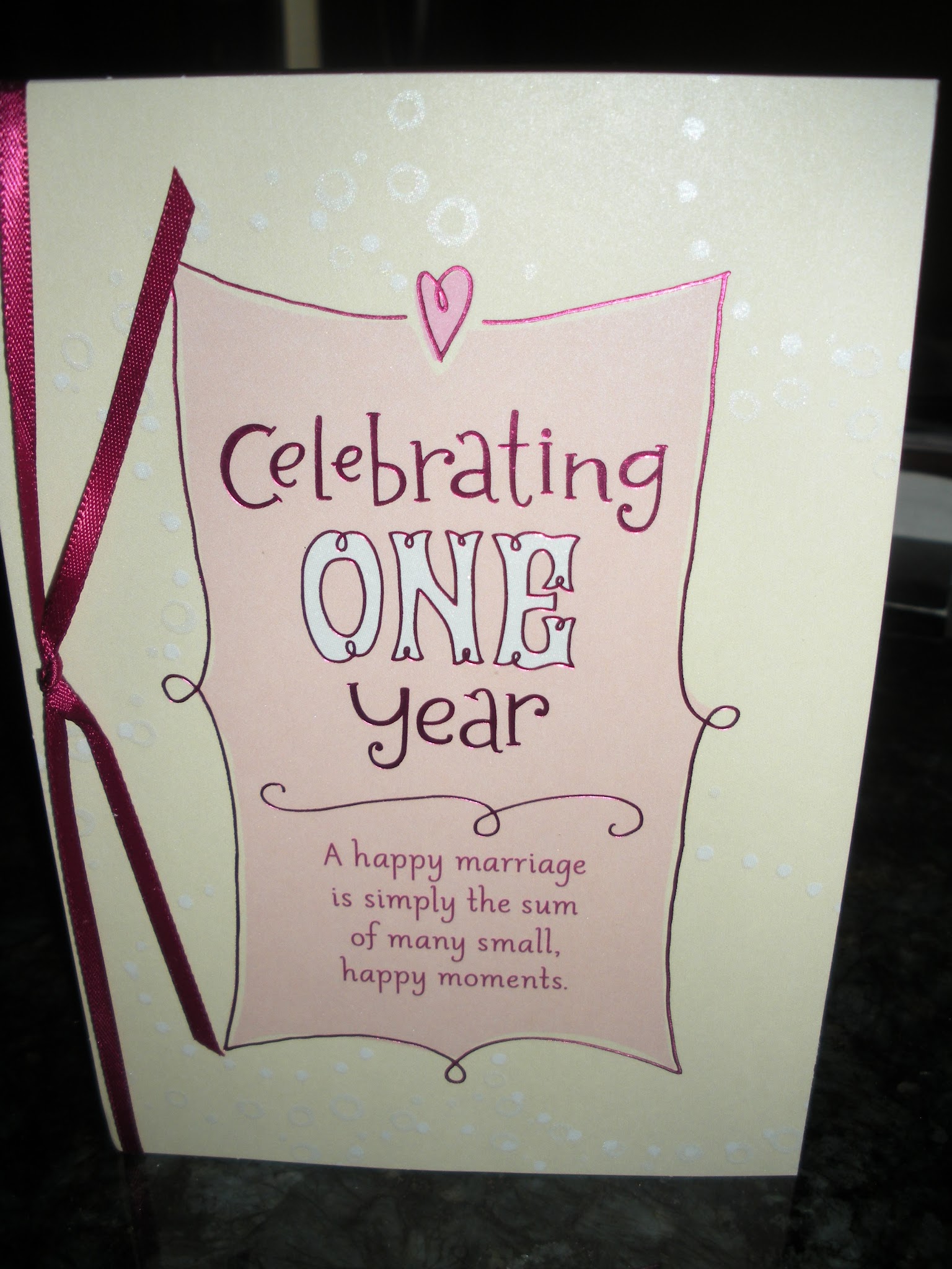 Finally, we got the following card in the mail this week. Can you believe it , our 1st wedding anniversary is coming up this weekend.