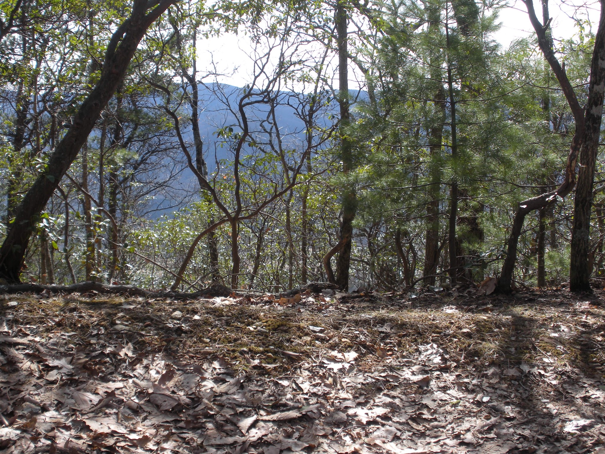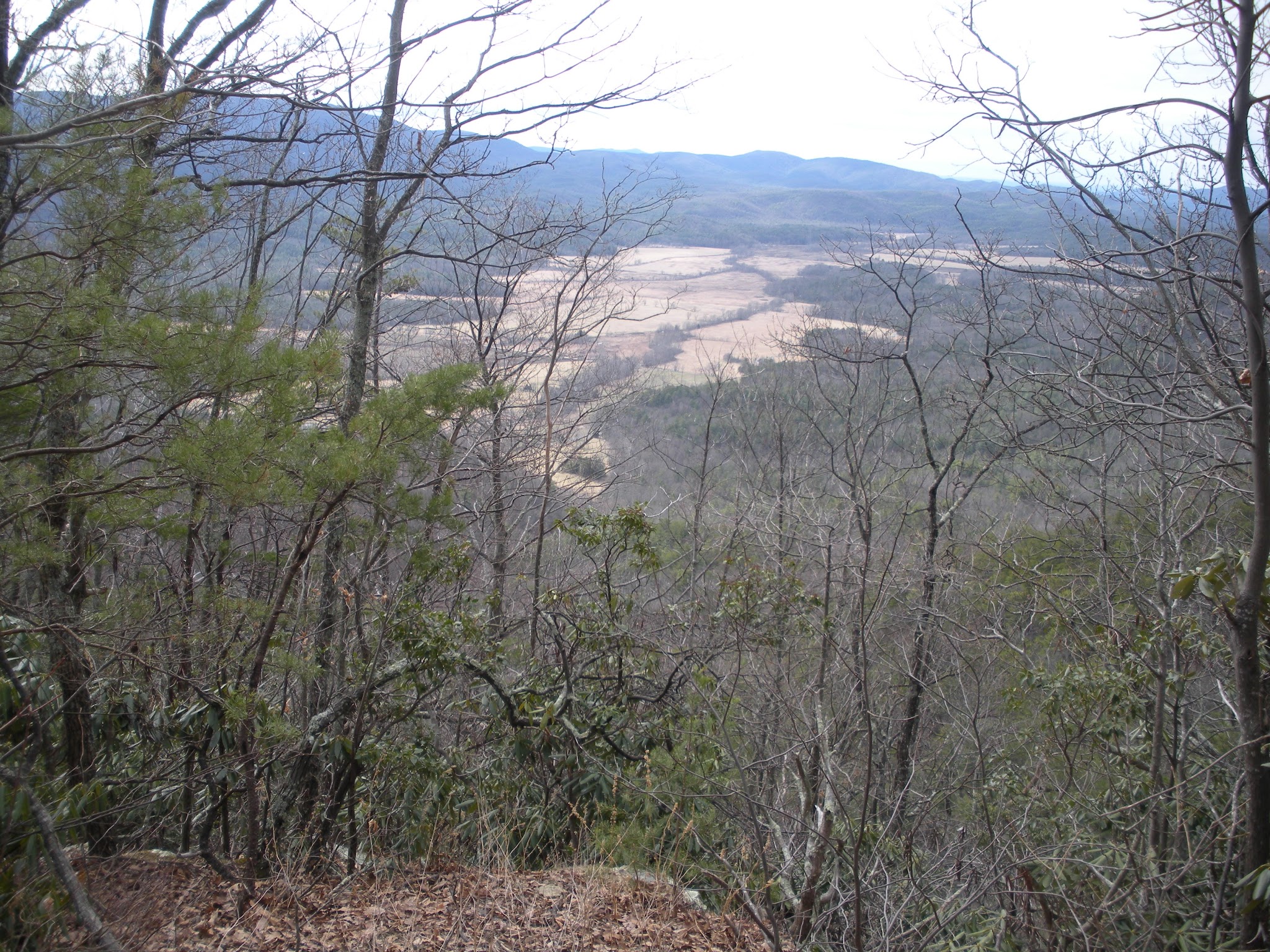We finally reached the ridgetop and views opened on each side. The photo below is looking back toward the foothills and Townsend, TN. Note the curled leaves of the rhododendren. Winter is here and the plant is self protecting from the cold and wind.