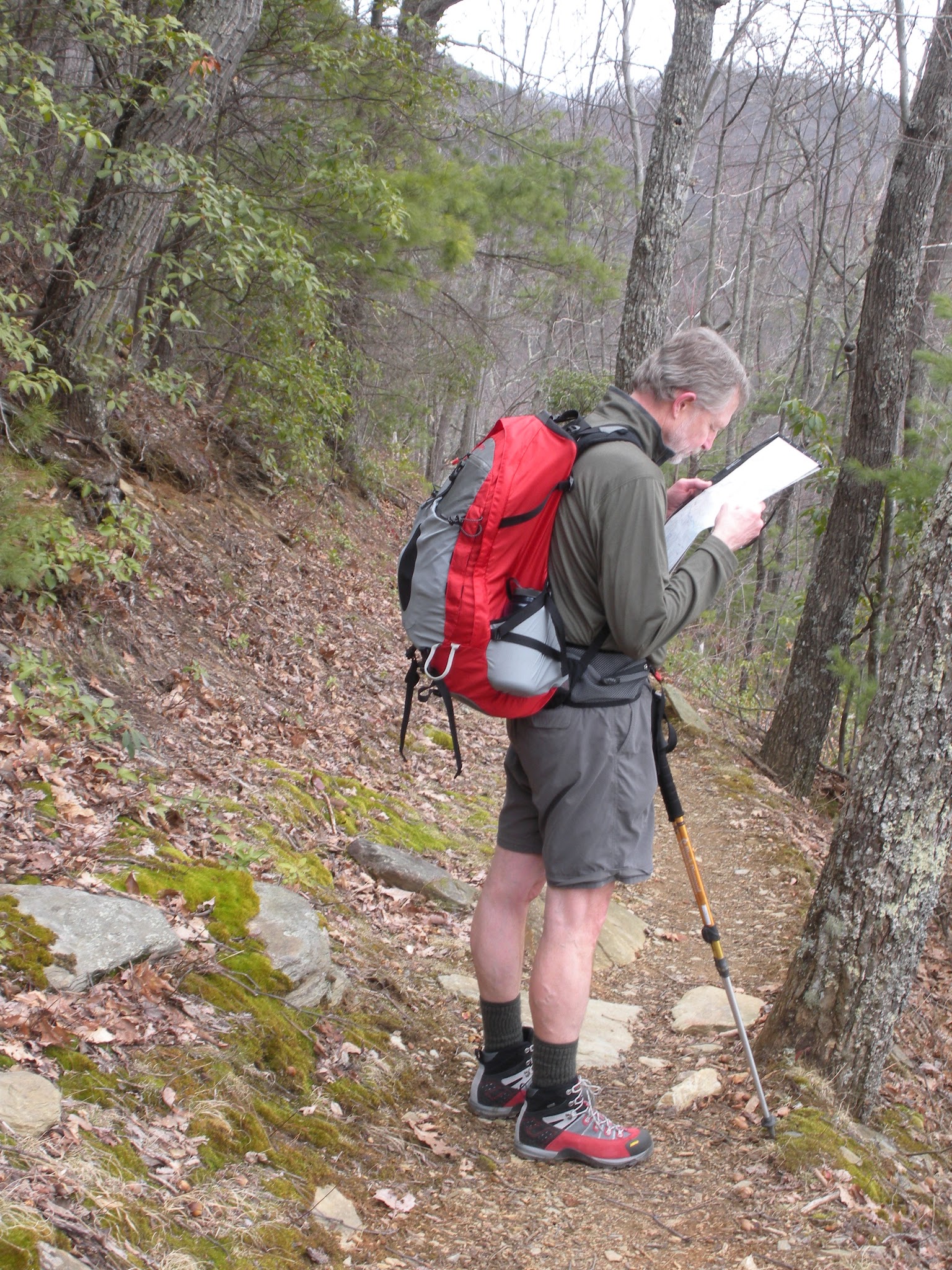 John stopped to look at the view and compare it to the map. We decided we were looking toward Russell and Spence Field. Above his head is the ridgeline we would hike along….once we reached the ridge.