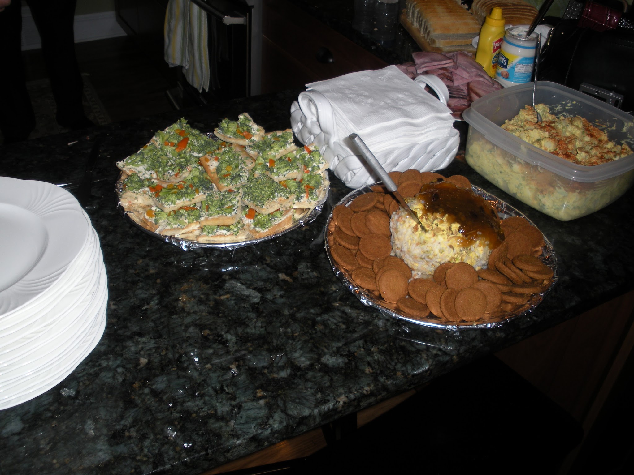 Some of the incredible food: from Vicky, vegetable pizza, curried cheese ball with mango chutney and ginger snaps and chocolate chip wedding cookies. From my sister Leslie’s in-laws, baked ham, homemade loaves of yeast bread, potato salad, baked beans and The Cup cupcakes.