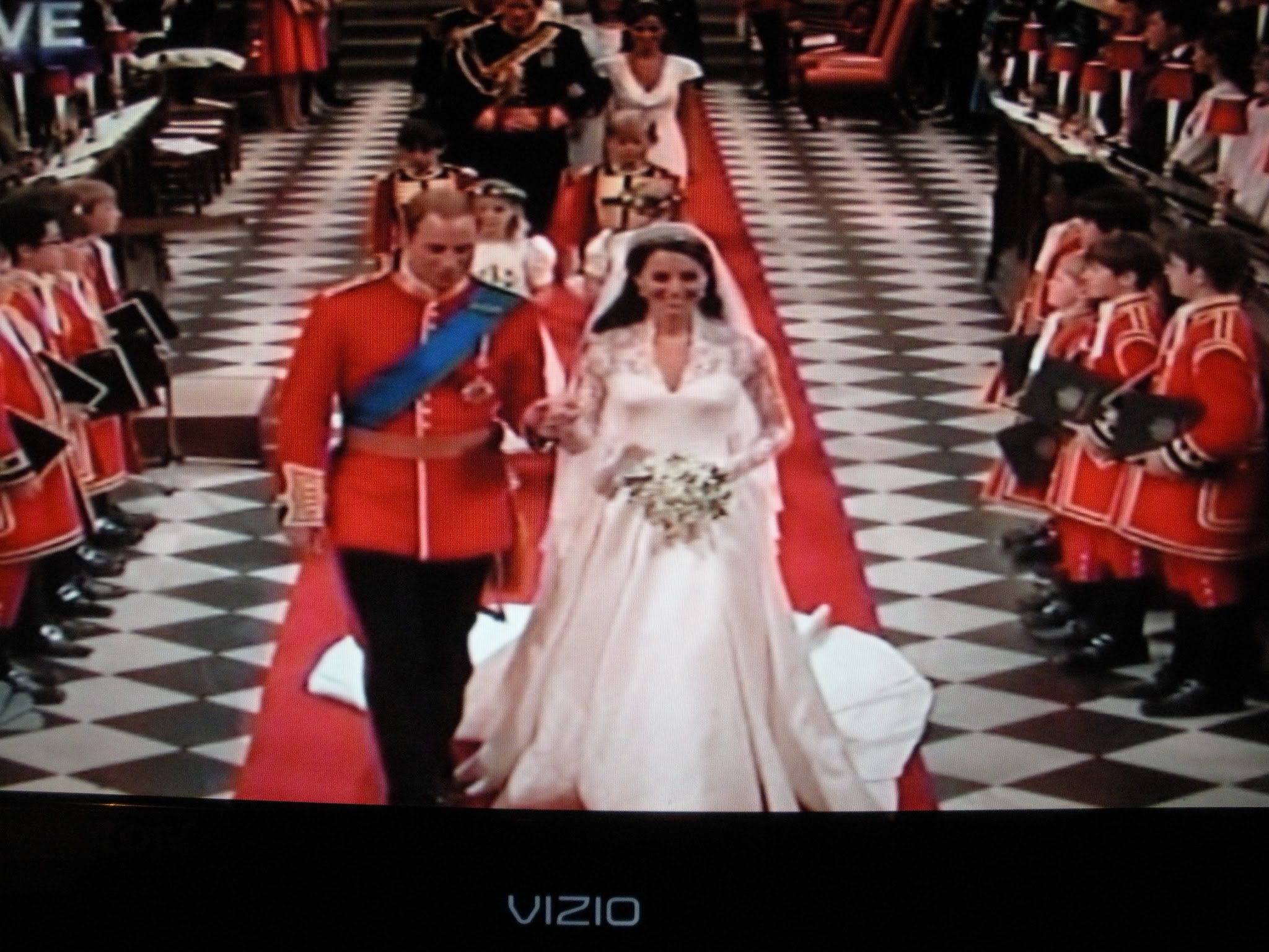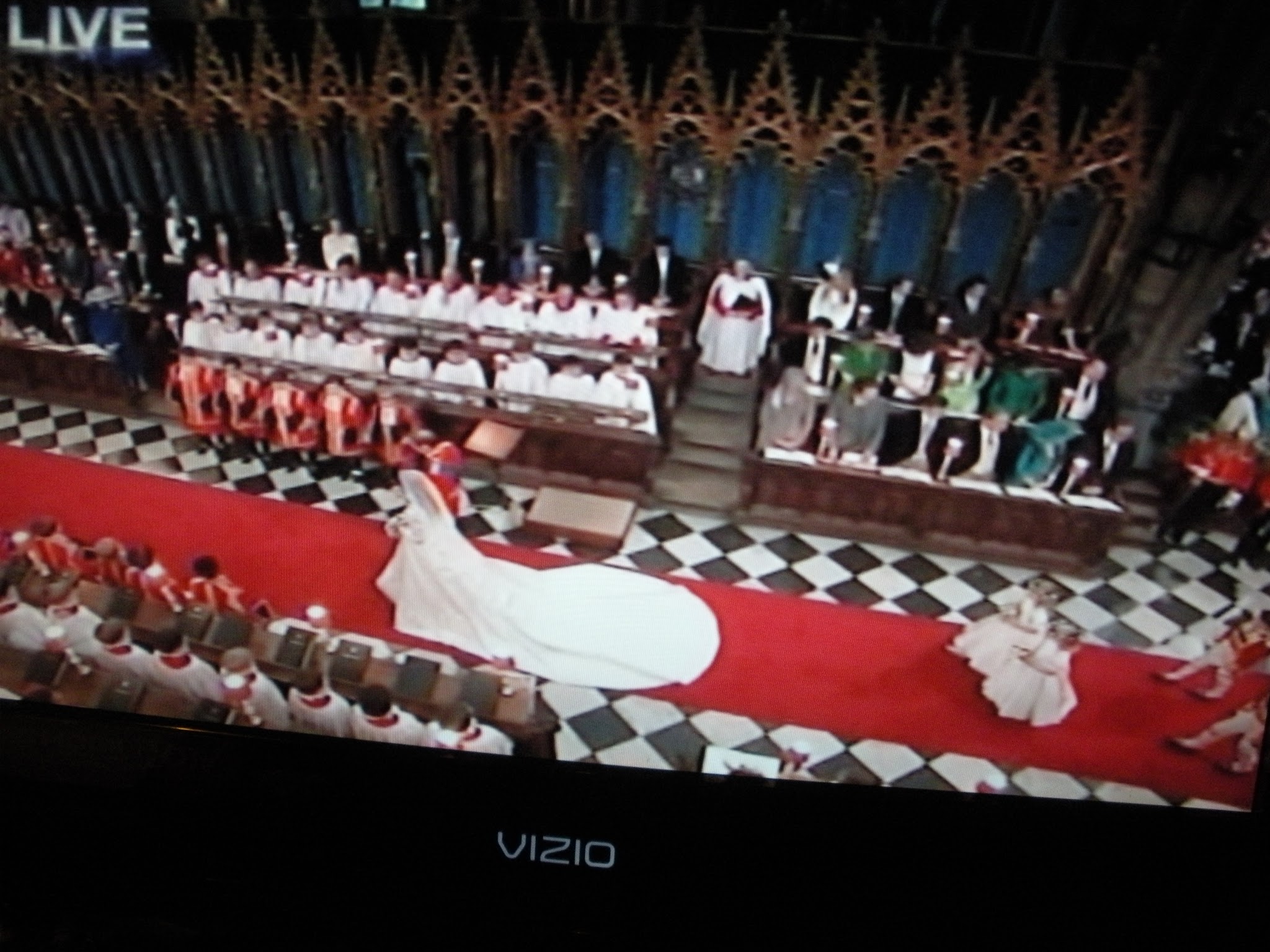 The cathedral was decorated to resemble the English countryside with dozens of live trees lining the nave. I suspect brides all over the US will be looking for a cathedral wedding. I also expect live trees will be rolled in and out of these churches. The florist job just got physically more difficult!