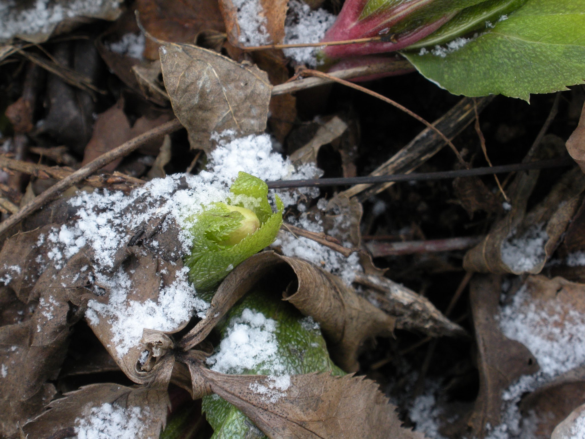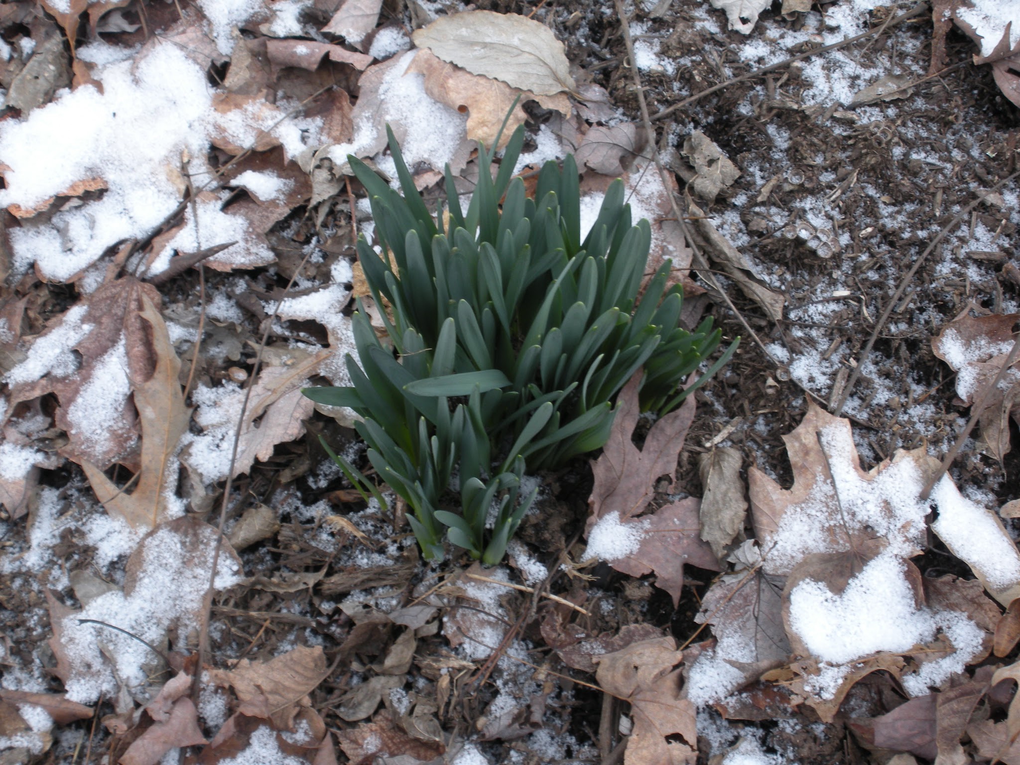 After the run, I took the opportunity to walk around the yard. Along with the cold temperatures, we had a bit of snow last night.  Daffodil leaves are about 8″ above ground now.  My initial surprise quickly subsided as I remembered that the temperatures in Knoxville have been hovering in the 50’s daytime and 40’s nighttime.  The daffodils are as confused as we are.