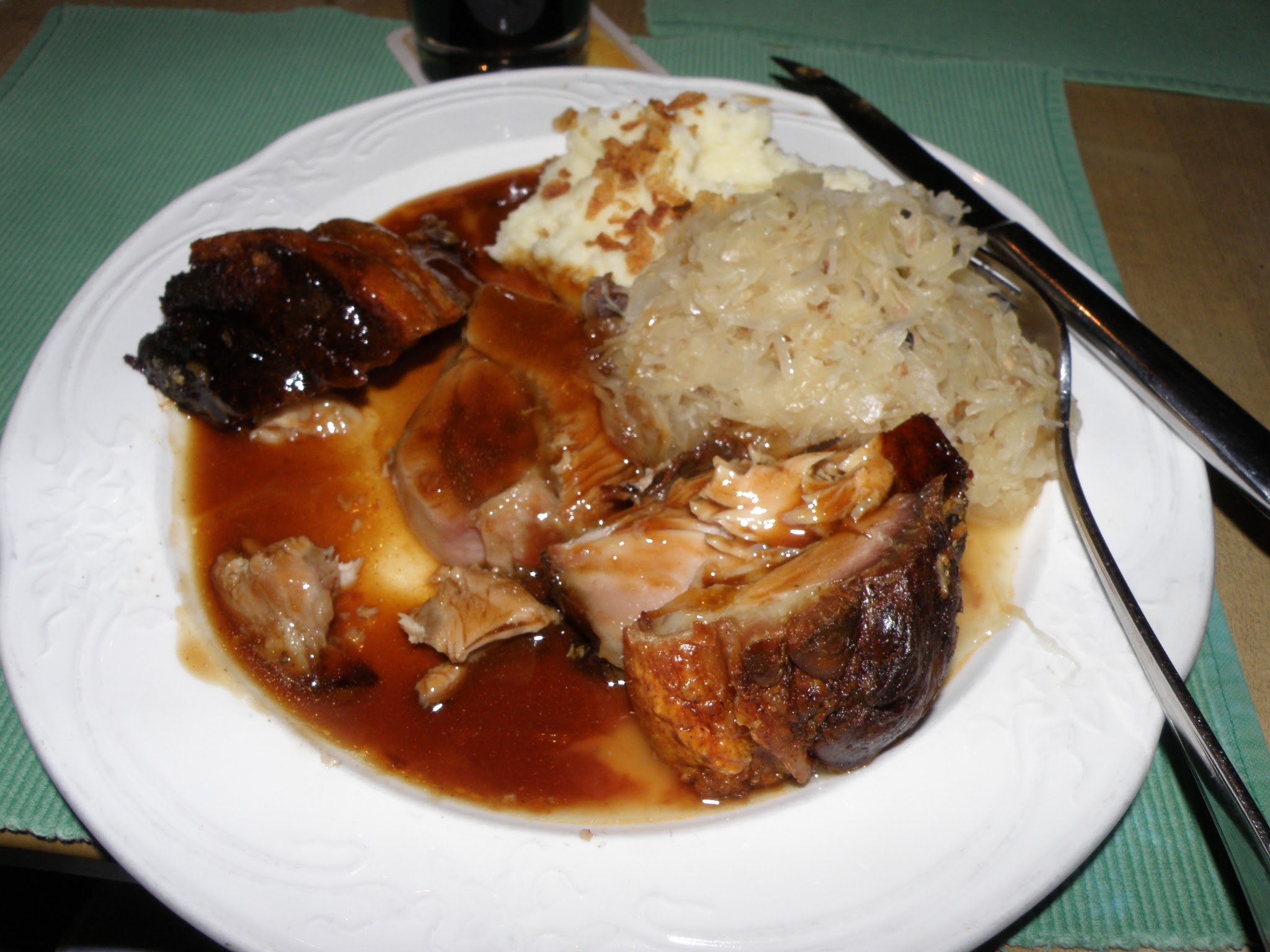 Everyone ordered a combination of veal and pork knuckles, except Torre, whose food choices include no meat. Below is pictured a half knuckle serving, a full serving would be just too much. Along with knuckles, we had pretzels for bread, mashed potatoes and sauerkraut. Yum, yum!