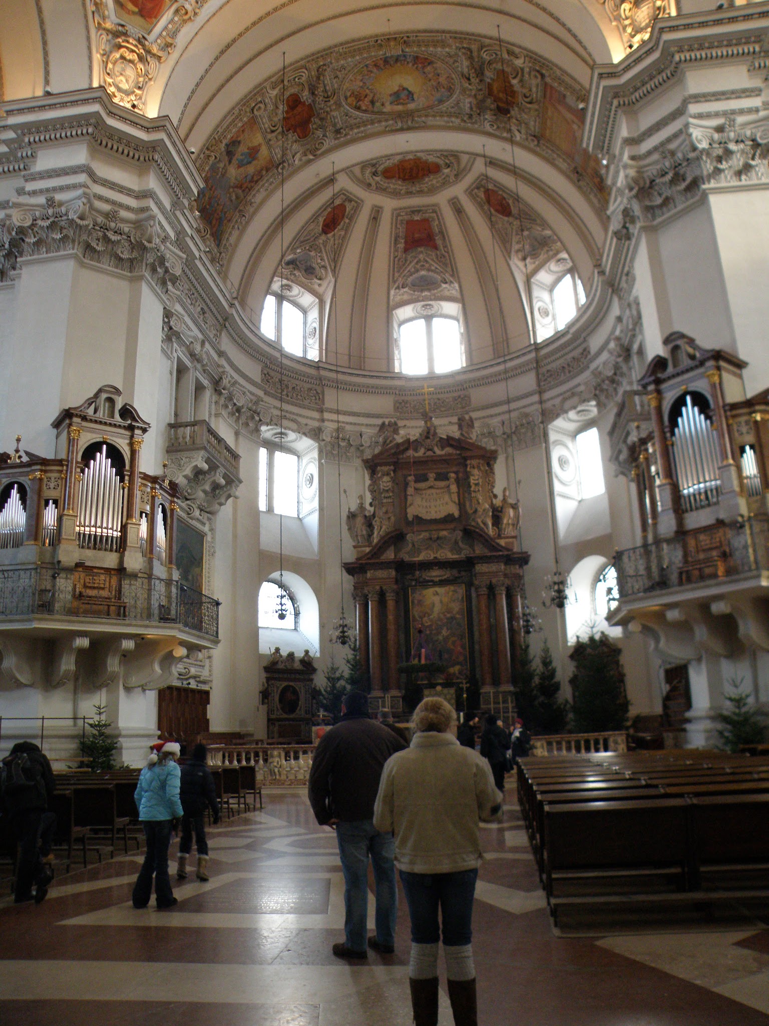 Catholicism is the main religion of Salzburg and several cathedrals were located on the outskirts of  the Christmas market in Domplatz. The first cathedral we explored was Salzburg Cathedral or Salzburger Dom.  The Dom is known for its Renaissance architecture and 4,000 pipe organ.  Massive bronze doors open to expose  a soft white and sepia interior.  Just inside the front doors sits a large font. Mozart was baptized here and later served as the organist.